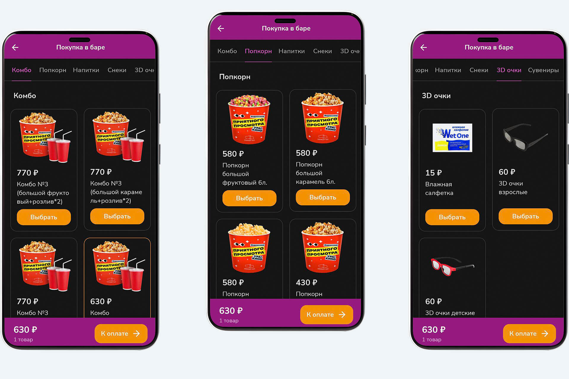 В разделе «Кинобар» можно купить со скидкой 30% и забрать без очереди попкорн, напитки, комбо наборы, снеки, 3D очки (скоро они нам понадобятся, друзья, не сомневайтесь) и сувениры.