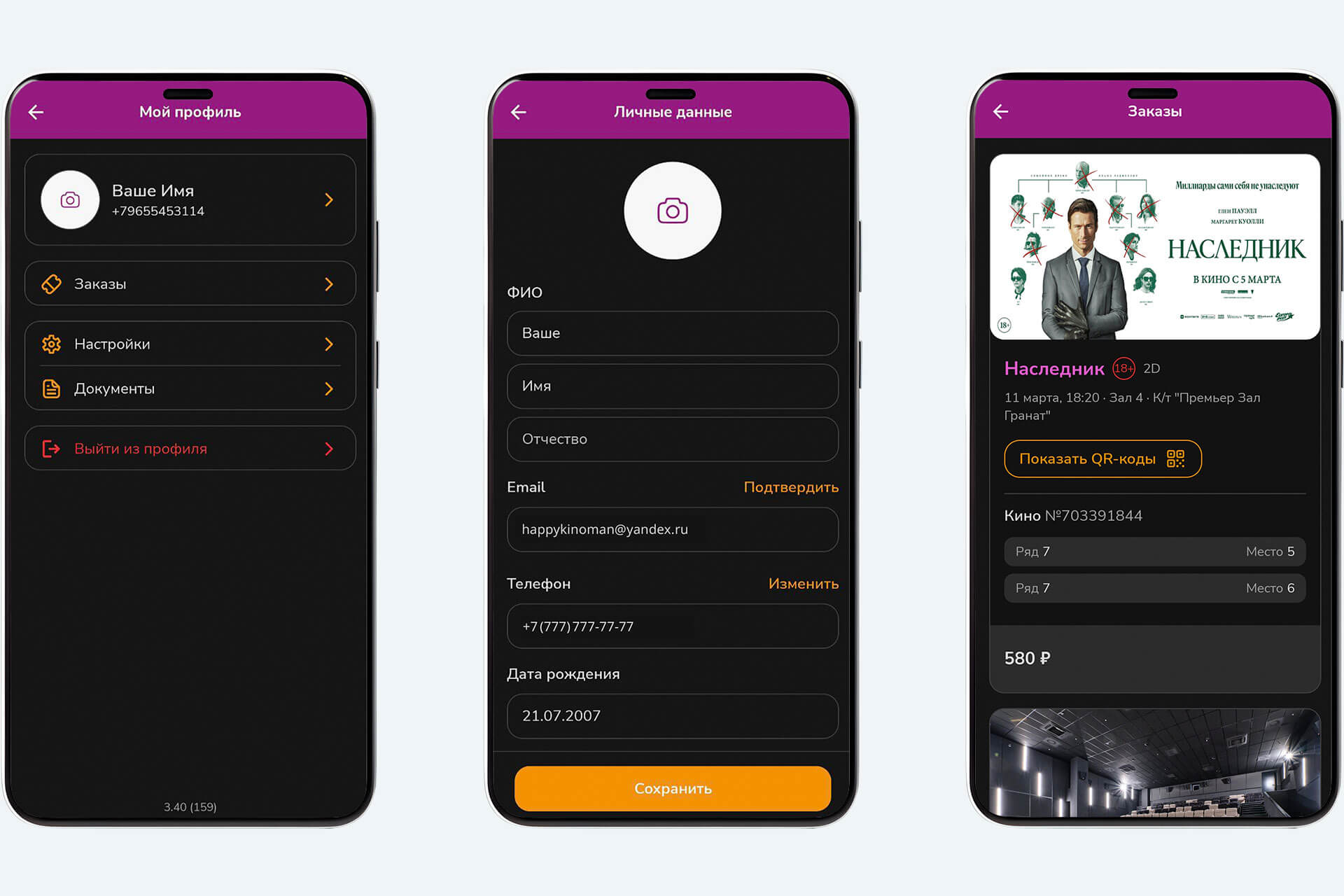 - QR-код заказа находится в разделе «Мой профиль». Перейдите в него и нажмите на кнопку «Заказы». Откроется список оформленных заказов — фильмов, событий и кинобара.