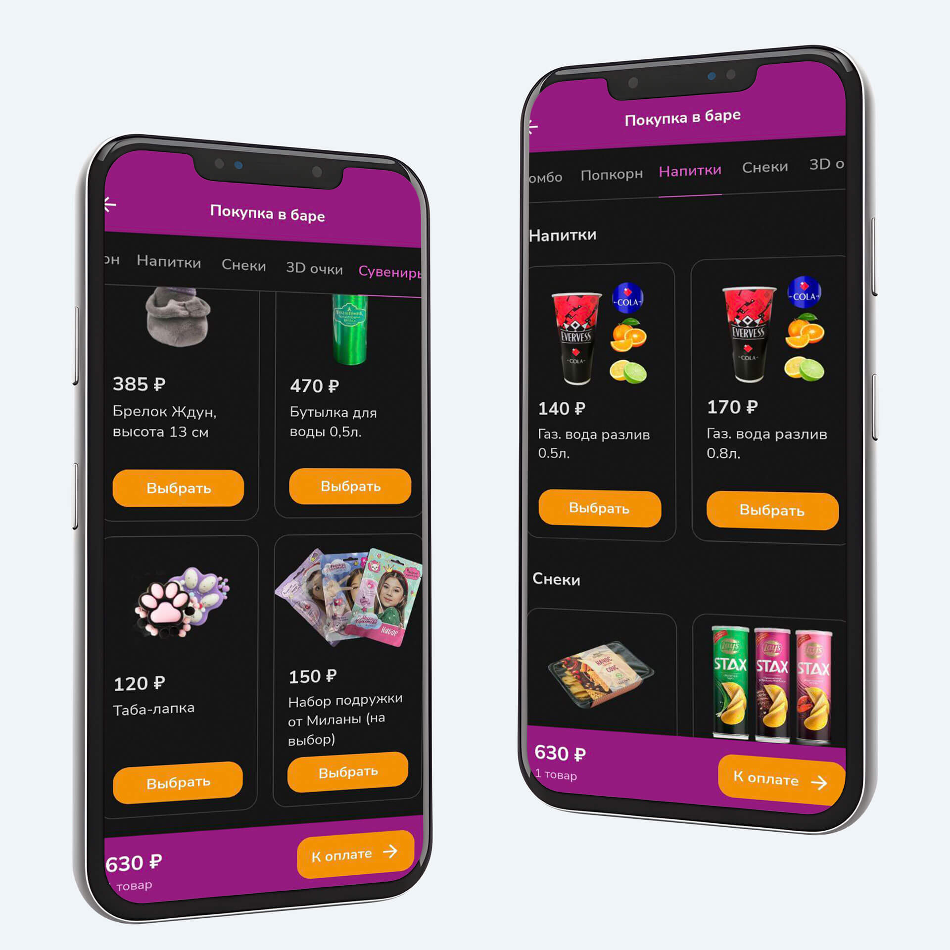 - Кинобар — выбор напитков, покорна и комбо наборов, а также аксессуаров