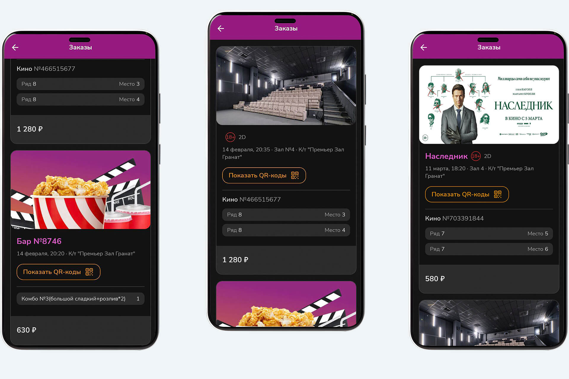 В списке совершенных заказов отображаются билеты на сеансы, а также покупки в кинобаре, совершенные в Приложении.
