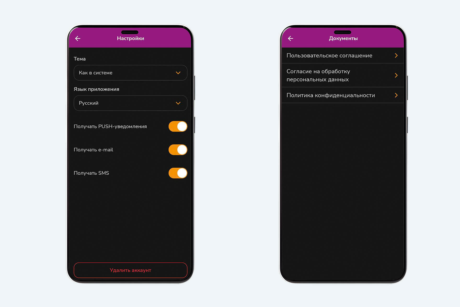 В разделе «Настройки» можно выбрать цветовую тему Приложения, язык отображаемой информации (доступны для выбора русский и английский), а также настроить уведомления.