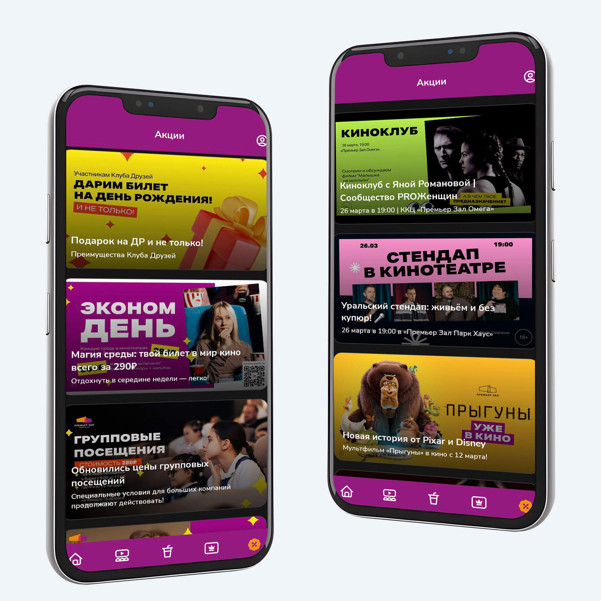 - Раздел «Акции» — содержит информацию об актуальных акциях в кинотеатрах, а также анонсы ведущих фильмов и событий