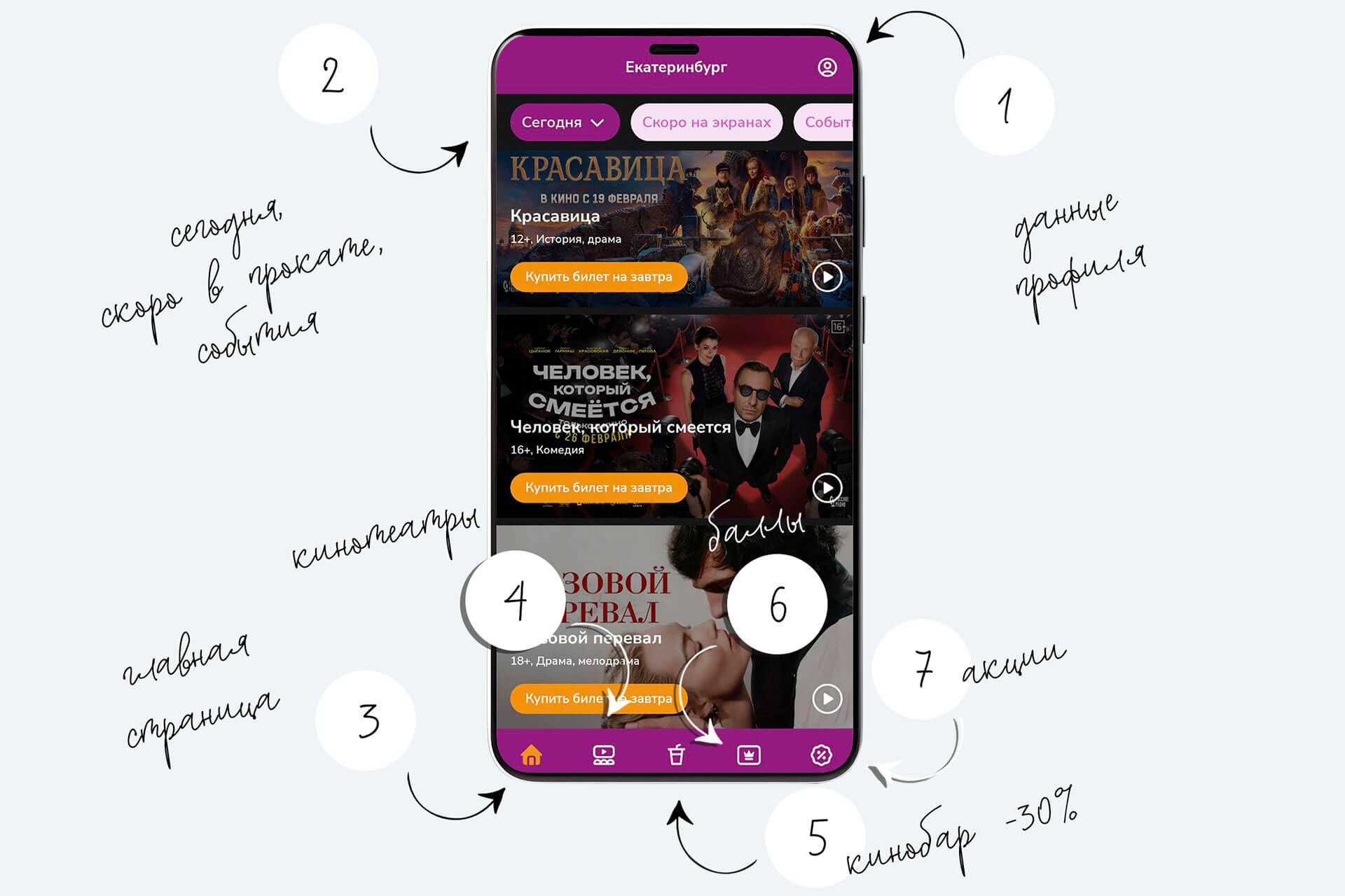 - При заказе фильма — номером билета, названием фильма, возрастным ограничением, форматом сеанса (2D или 3D), датой и временем сеанса, номером зала, названием любимого кинотеатра. Экран смартфона будет дополнительно подсвечен для оперативного и корректного считывания.