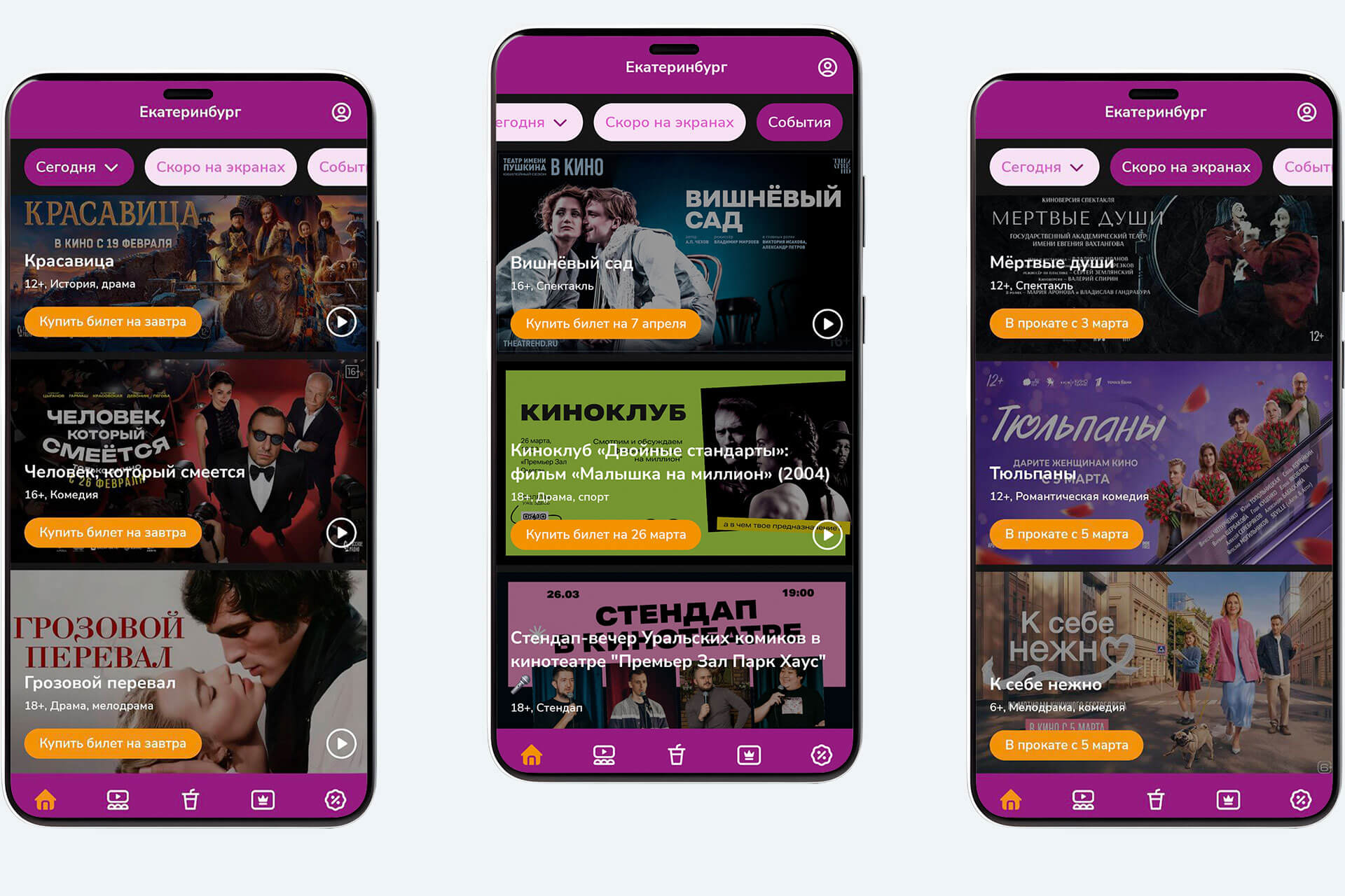 - Афиша кинотеатров на сегодня, вкладка «Скоро на экранах», вкладка «События»